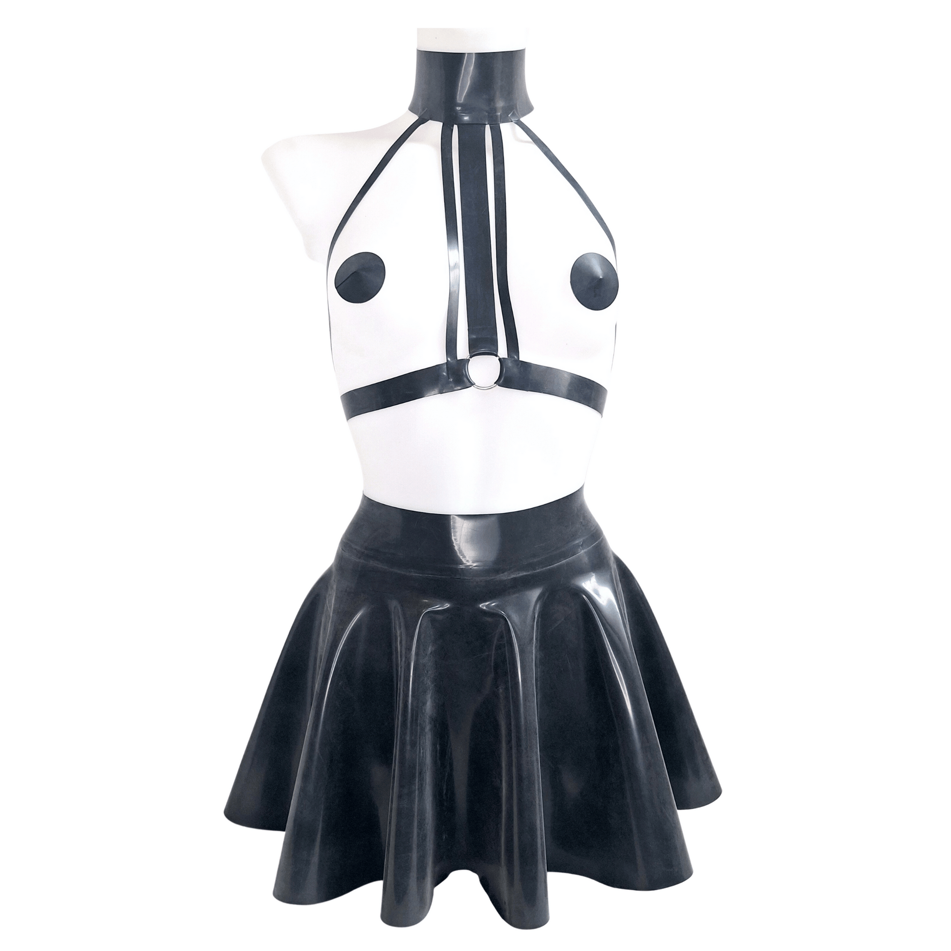 Unleash your desires and embrace the allure of our Black Latex Chest Harness, Skater Skirt & black latex round nipple pasties set. With its bold design and fetish-inspired details, this ensemble is a perfect choice for those seeking to indulge in a chic and provocative look. Order yours today and prepare to captivate with your unique style.