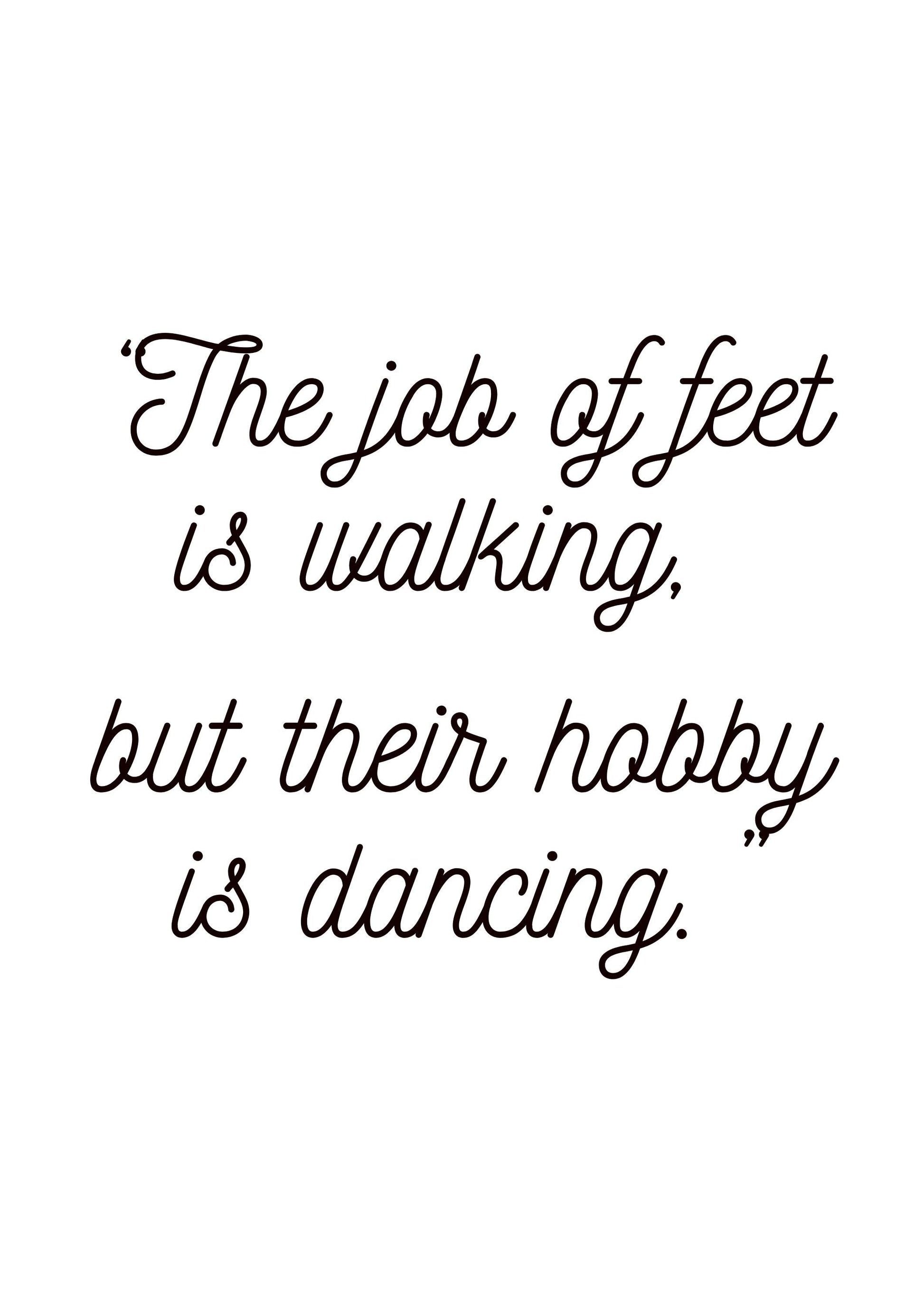 The job of feet is walking, but their hobby is dancing.” printable wall art. A4 size digital download for you to print at home Please note this is a digital item and no product will be shipped REFUNDS Due to the nature of the file, these are permanent and therefore no refunds/cancellations can be offered. This item is for personal use only and may not be resold.