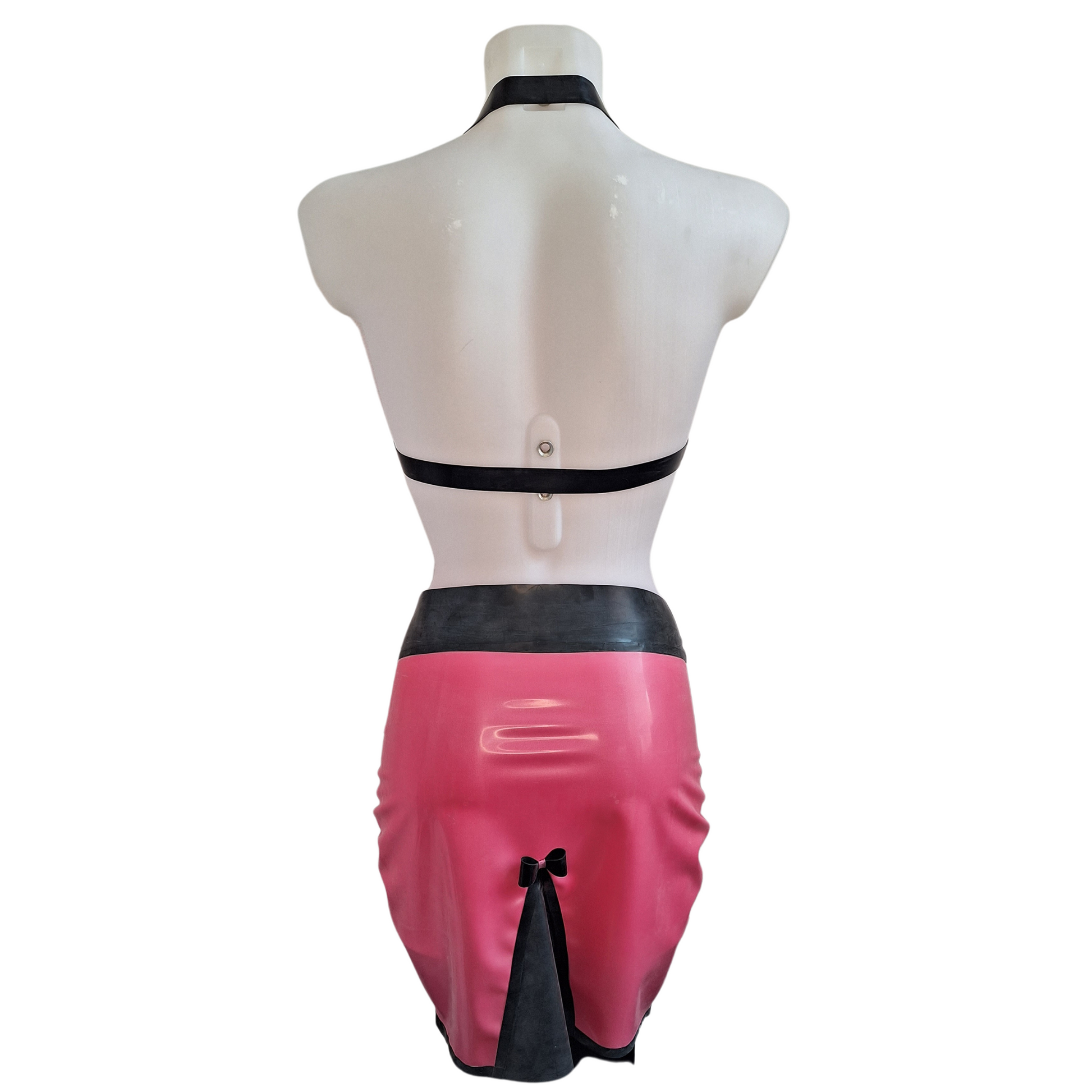 Bring out your inner Barbie with this Metallic Fuchsia Pink & Black Kick Flare Skirt & O Ring Bra Set! This set includes a beautiful O ring bra and a matching kick flare skirt, both finished in metallic fuchsia pink with black accents. The skirt features a black kick flare at the back, which is trimmed in black and finished with a cute black bow, adding a touch of elegance to your outfit.