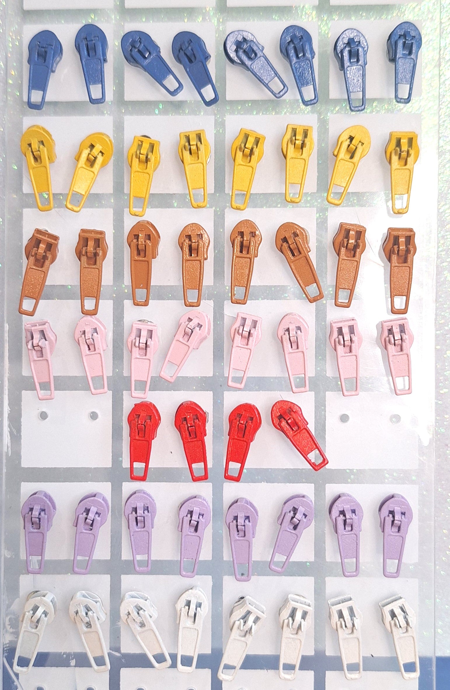 Blue, Yellow, brown, pink, red, lilac, & white.